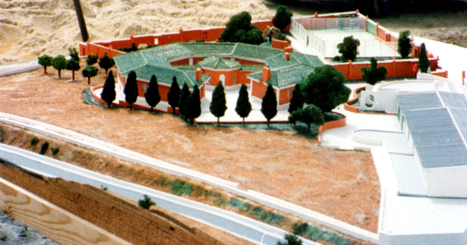 A segunda encomenda de maqueta de arquitectura foi de um arquitecto de que não recordo o nome. Era um projecto megalómano, de uma moradia gigantesca, para um terreno situado ao lado do “campo da bola” do Monte de Caparica. Claro que essa moradia nunca seria construída. Nas fotos abaixo (feitas pelo arquitecto) pode ver-se a maqueta que realizei e... nas imagens do Google Maps a seguir, pode ver-se o que foi entretanto construído...